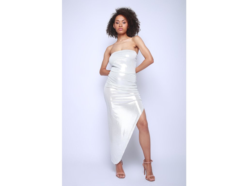 Stříbrné asymetrické midi šaty Norma Kamali ve velikosti XS/S zaujmou originálním střihem a výrazným metalickým leskem. Asymetrický design s jedním odhaleným ramenem a rozparkem působí smyslně a zároveň elegantně. Lehký materiál se krásně přizpůsobí postavě a zvýrazní siluetu. Ideální model pro večírky a slavnostní příležitosti, kde chcete vyniknout a zazářit.