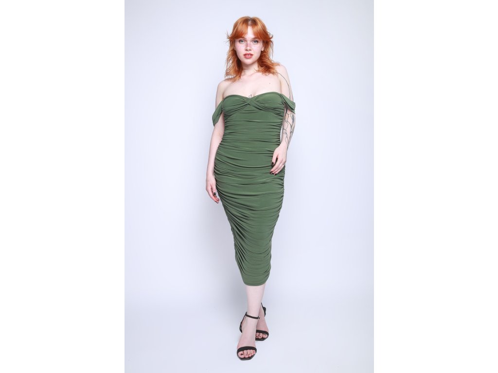 Zelené řasené midi šaty Norma Kamali – smyslný a elegantní model pro večírky i speciální události.