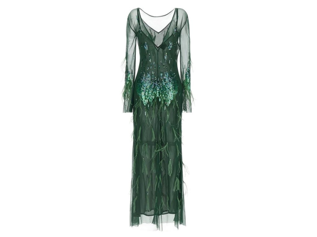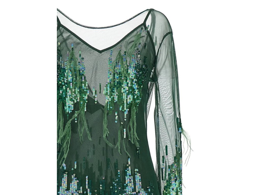 Zelené šaty s flitry a peříčky a průsvitnými rukávy Pinko